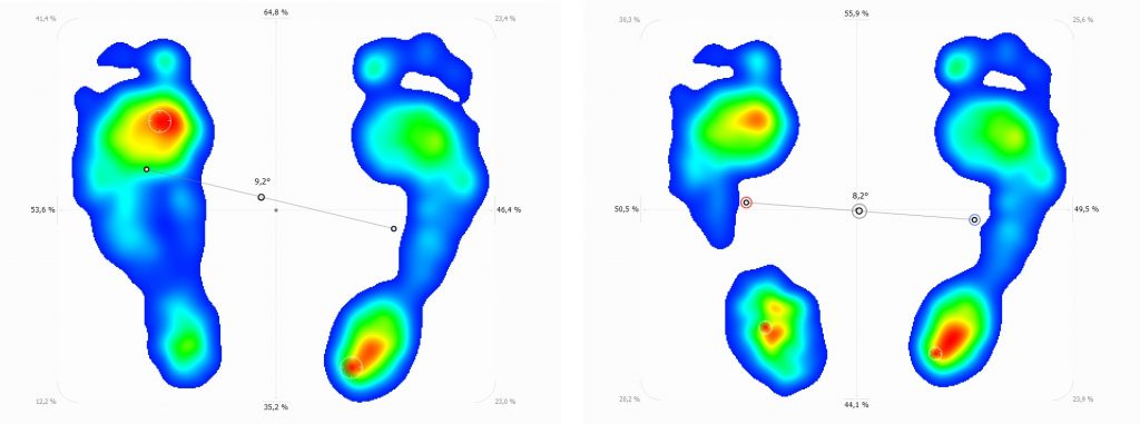Test du calage et baropodométrie : En position statique, ce test consiste à placer des cales de différentes hauteurs sous le pied afin d’améliorer l’alignement global du corps. Cet équilibre postural est mesuré à l’aide de différents outils comme un niveau pelvien ou un goniomètre spécifique. Un enregistrement avec les cales est également réalisé sur une plateforme baropodométrique afin d’en évaluer l’efficacité et pouvoir en mesurer l’évolution dans le temps.